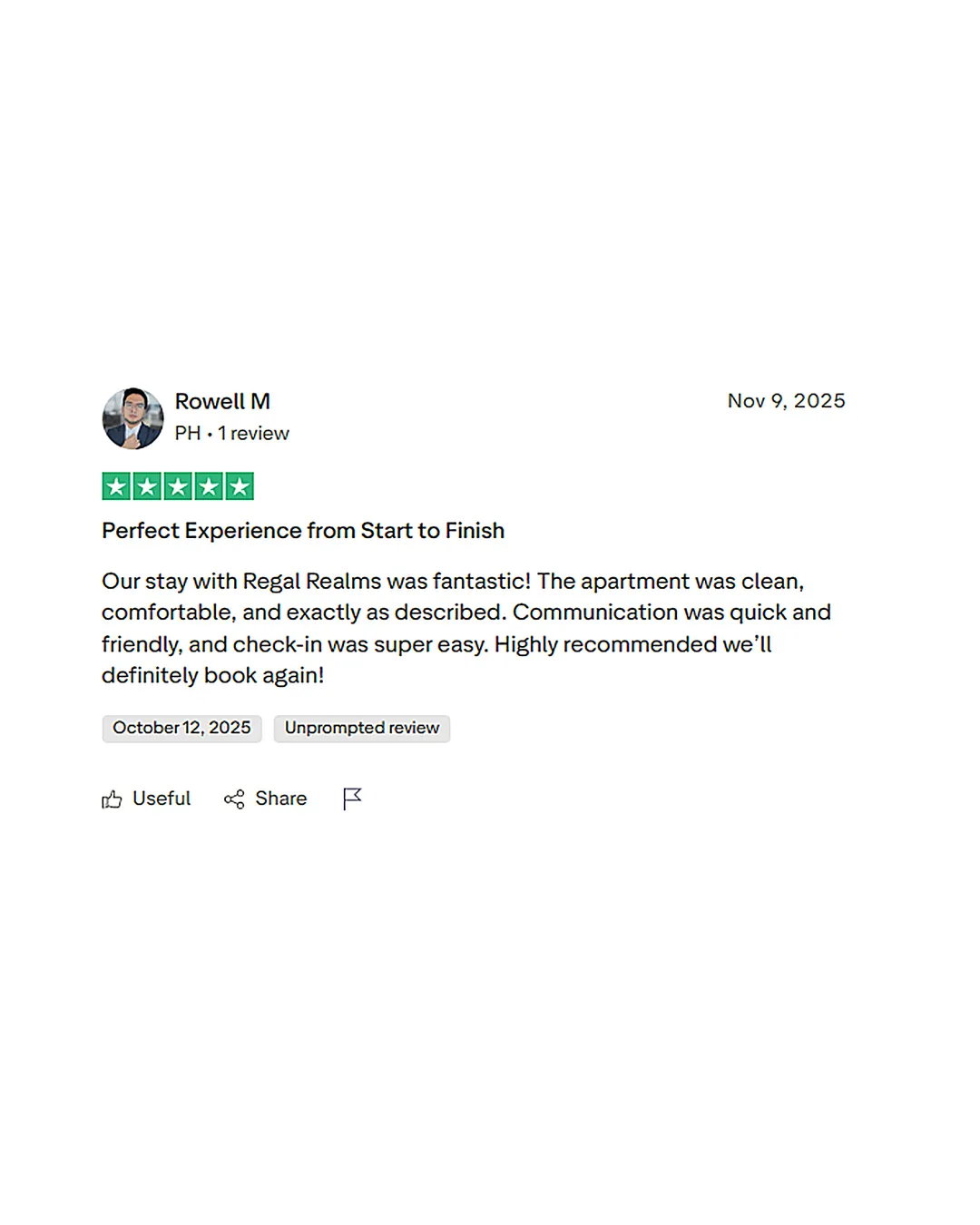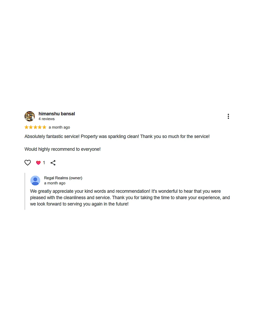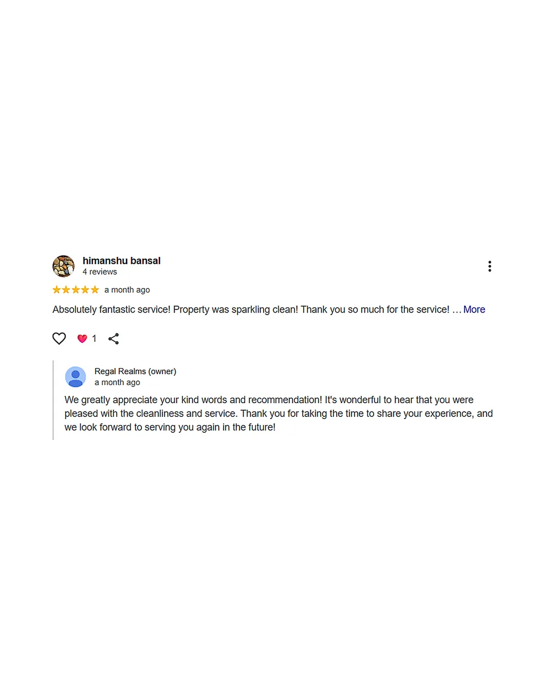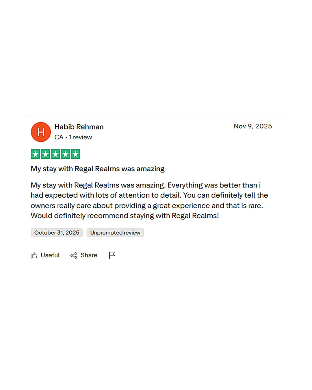 I care deeply about reliability and attention to detail, and Regal Realms truly exceeded my expectations. From the very beginning, every interaction felt professional, thoughtful, and effortless. Communication is clear, processes are smooth, and nothing is left to chance. I genuinely feel confident and at ease knowing my property is in the best hands.