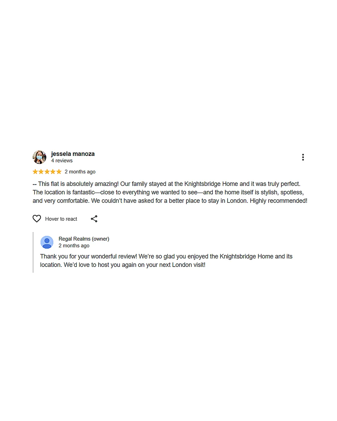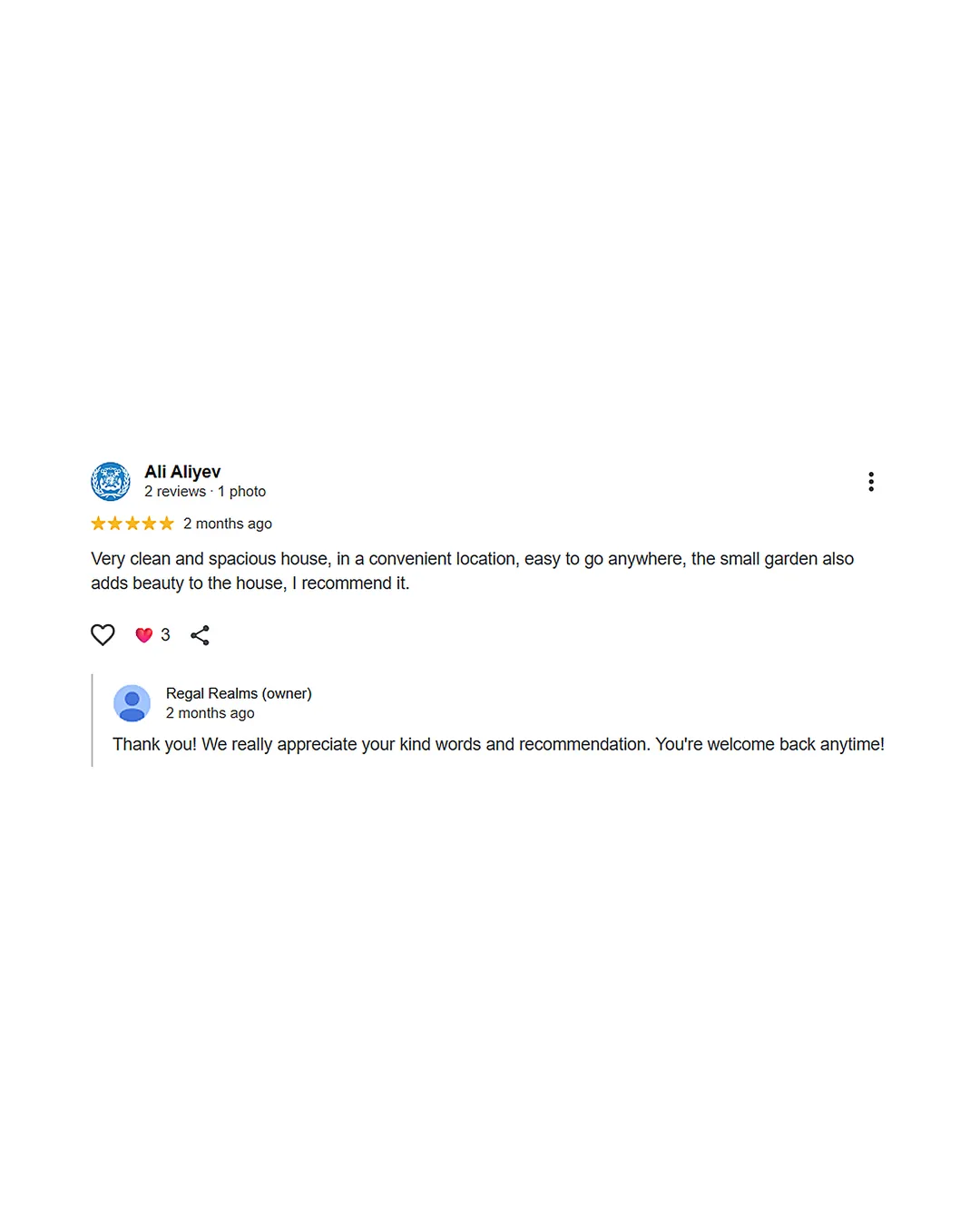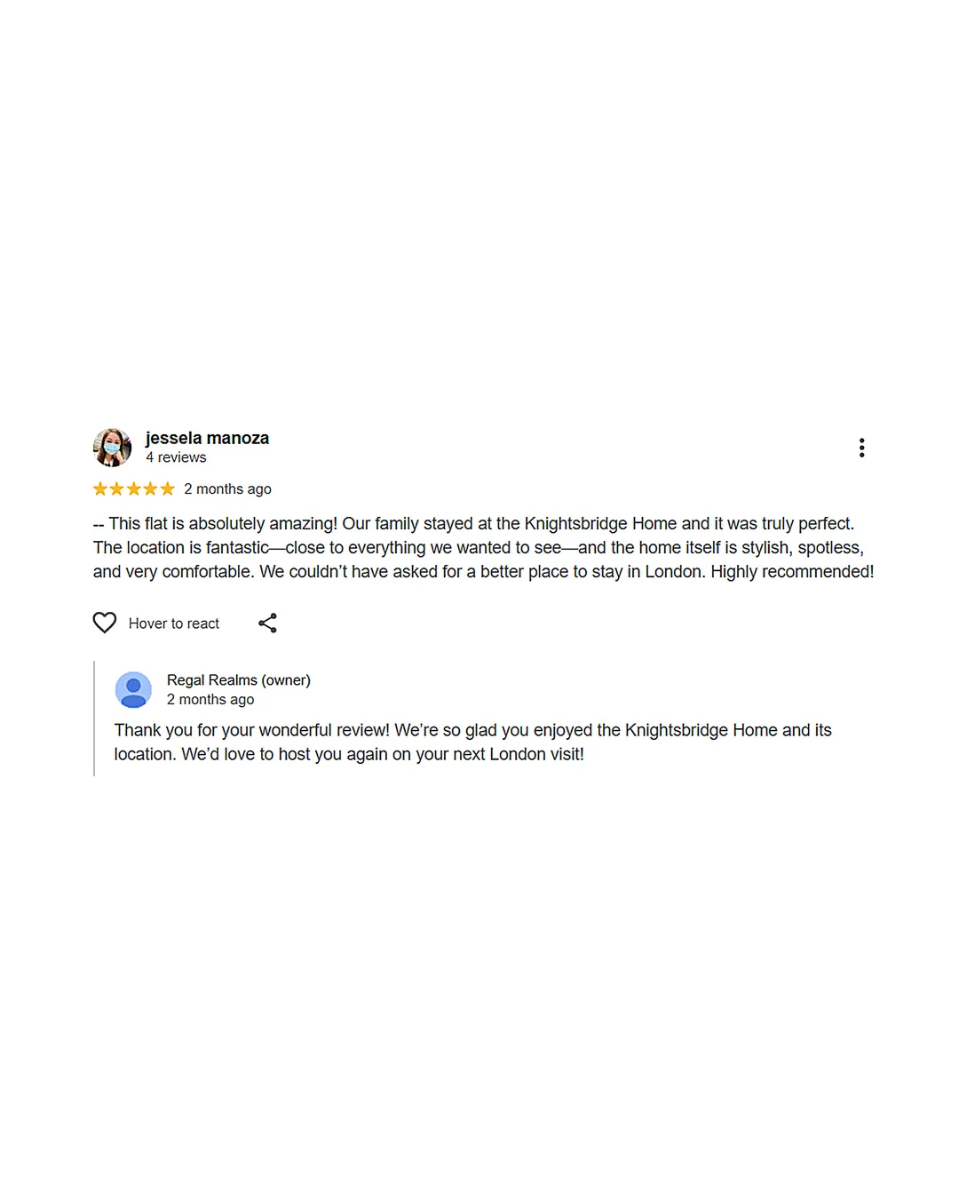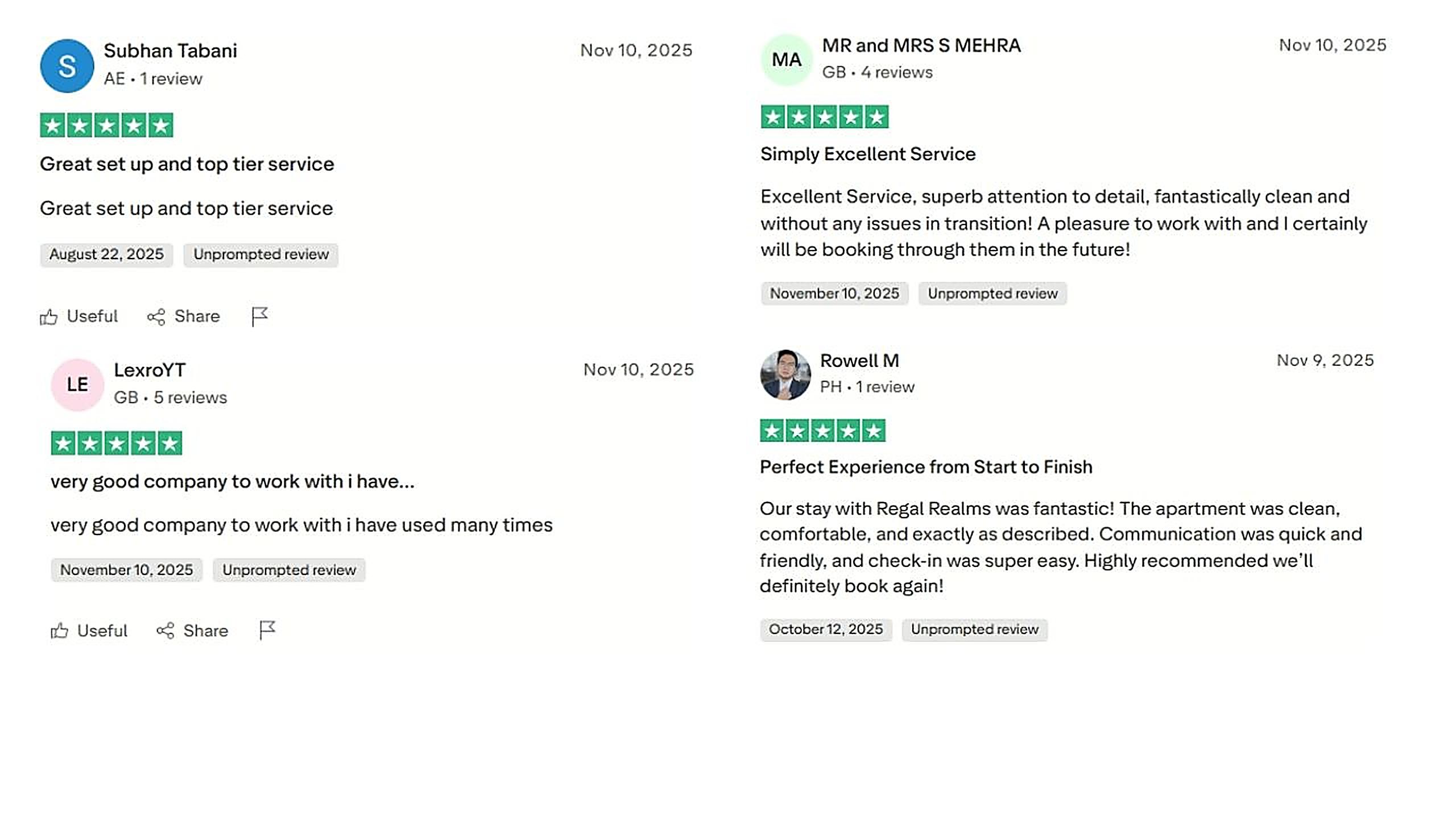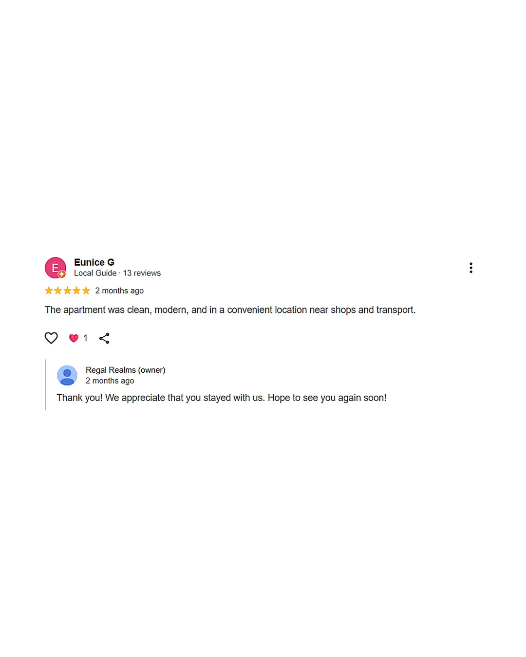 I care deeply about reliability and attention to detail, and Regal Realms truly exceeded my expectations. From the very beginning, every interaction felt professional, thoughtful, and effortless. Communication is clear, processes are smooth, and nothing is left to chance. I genuinely feel confident and at ease knowing my property is in the best hands.